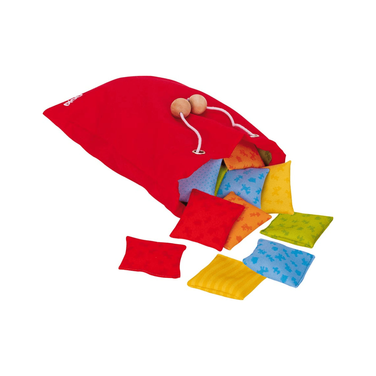 Dentro do saco estão 20 almofadas com várias texturas diferentes. Numa primeira fase, a criança observa e sente os saquinhos e encontra o par que tem a mesma textura. Numa fase posterior, a criança venda os olhos e tenta descobrir o par correto dos saquinhos apenas usando o sentido do tato. No final, verifica se está correto observando a cor e desenhos dos sacos. Se forem iguais, é porque está correto!