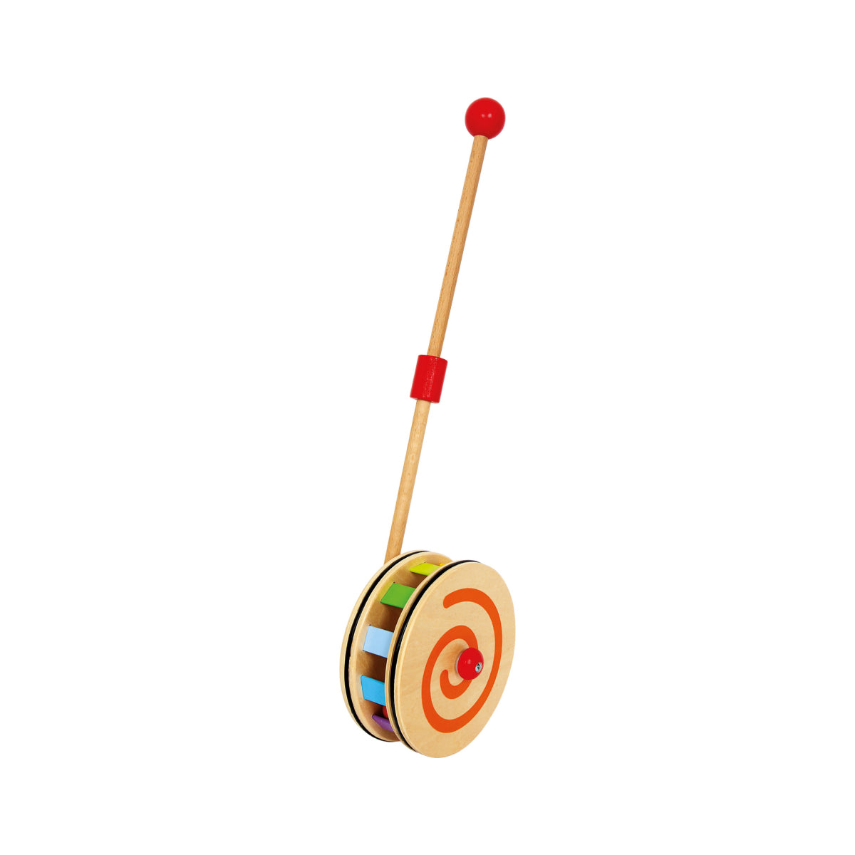 Três esferas coloridas fazem sons de chocalho neste brinquedo de empurrar. As cores do arco-íris vão girando e girando..!
