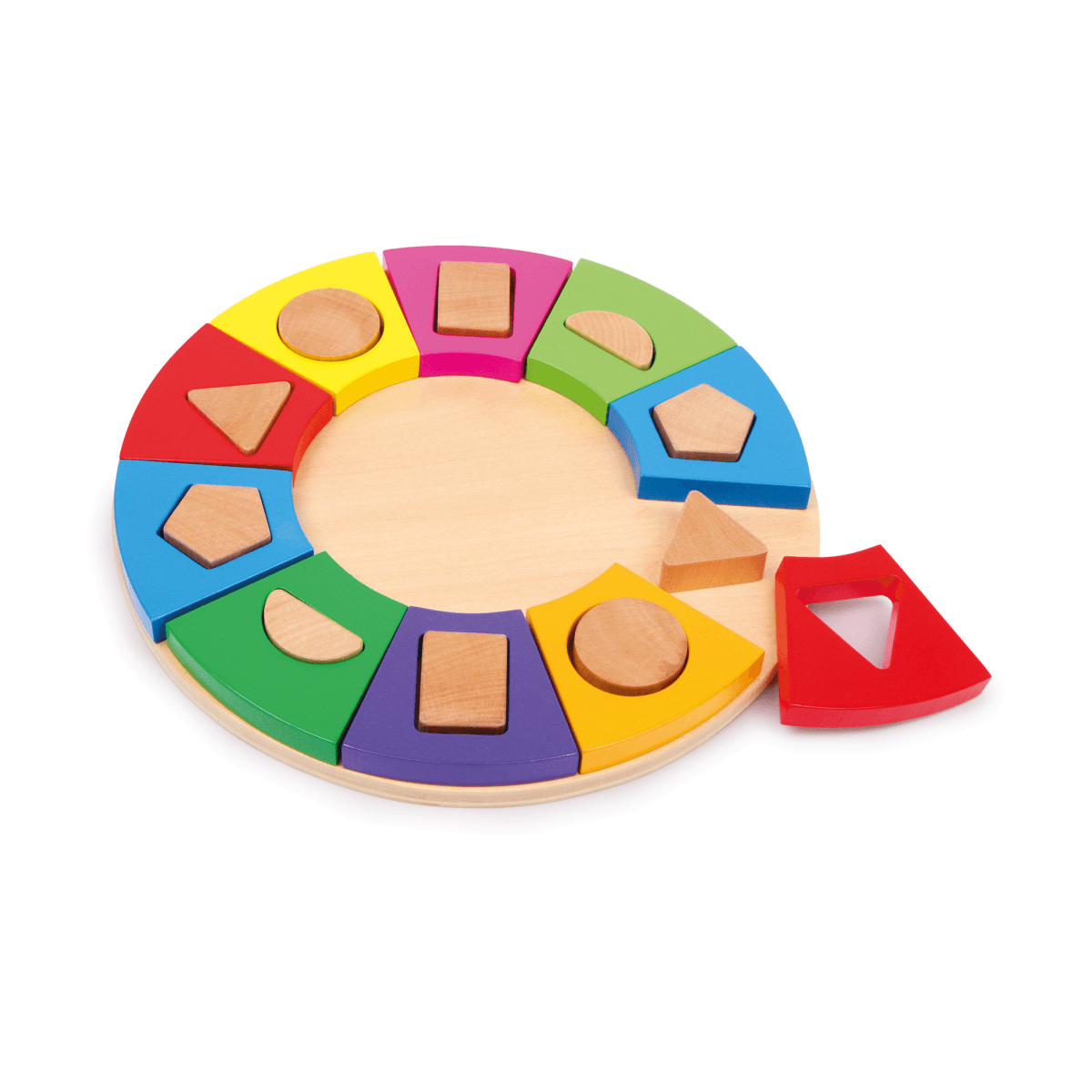 Os elementos coloridos devem ser encaixados no lugar certo nesta placa de madeira com figuras geométricas. Este desafio treina habilidades motoras e consciência espacial!