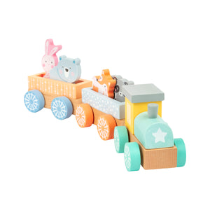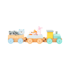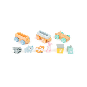 Este comboio em tons pastel tem dois vagões que podem ser acoplados através da conexão de inserção fácil e uma locomotiva. Os vagões têm espaço para os quatro passageiros: a raposa, o urso, o coelho e o guaxinim!