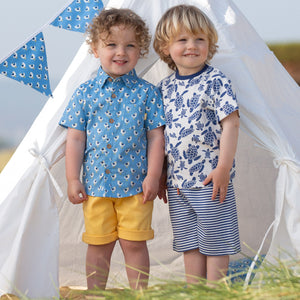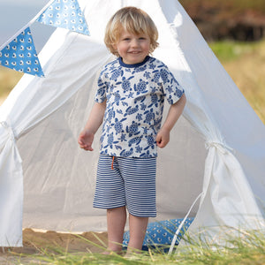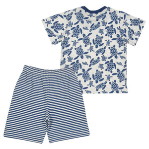 É composto por uns calções de listas brancas e azuis e a t-shirt super divertida com inúmeras tartarugas!