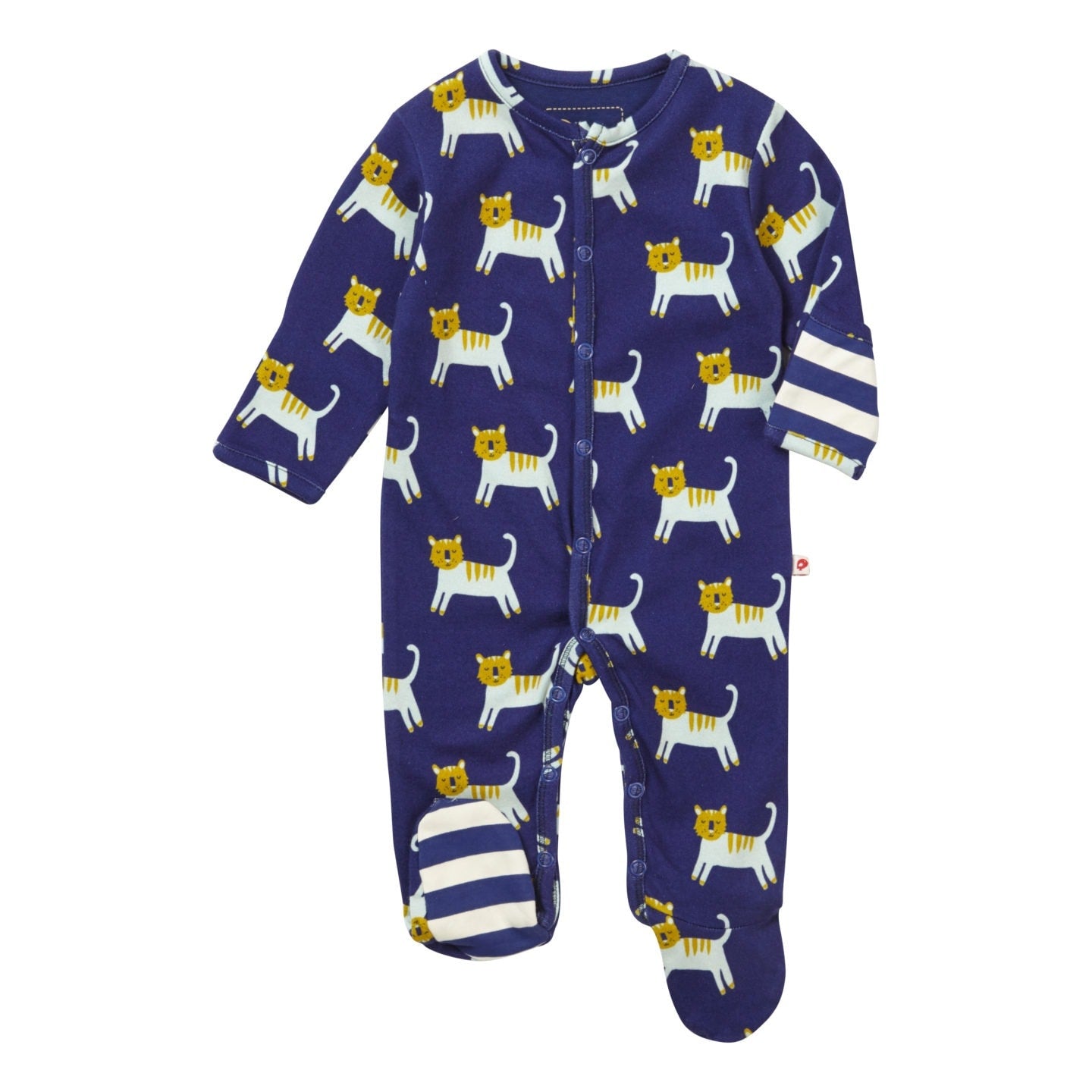 Tem um padrão divertido de tigres e nas mãos e pés tem um padrão de listas azuis e brancas. Possui luvas integradas para os dias mais frios!