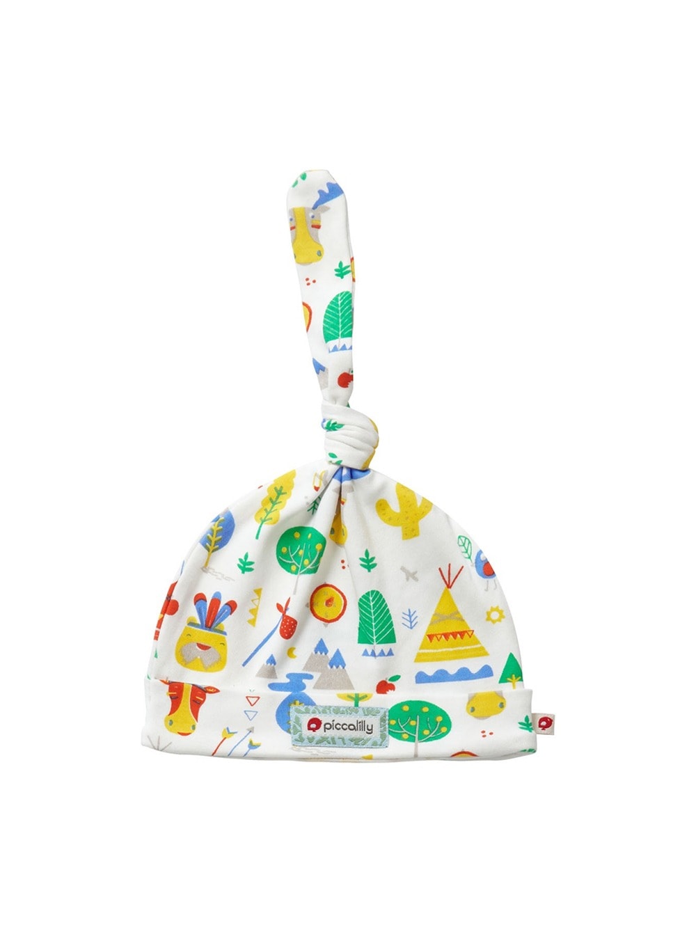 Este pequeno gorro para bebé tem o padrão de pequenos animais a acampar e a brincar ao ar livre. Possui um nó na parte superior que pode ser ajustado perfeitamente à cabeça do bebé.