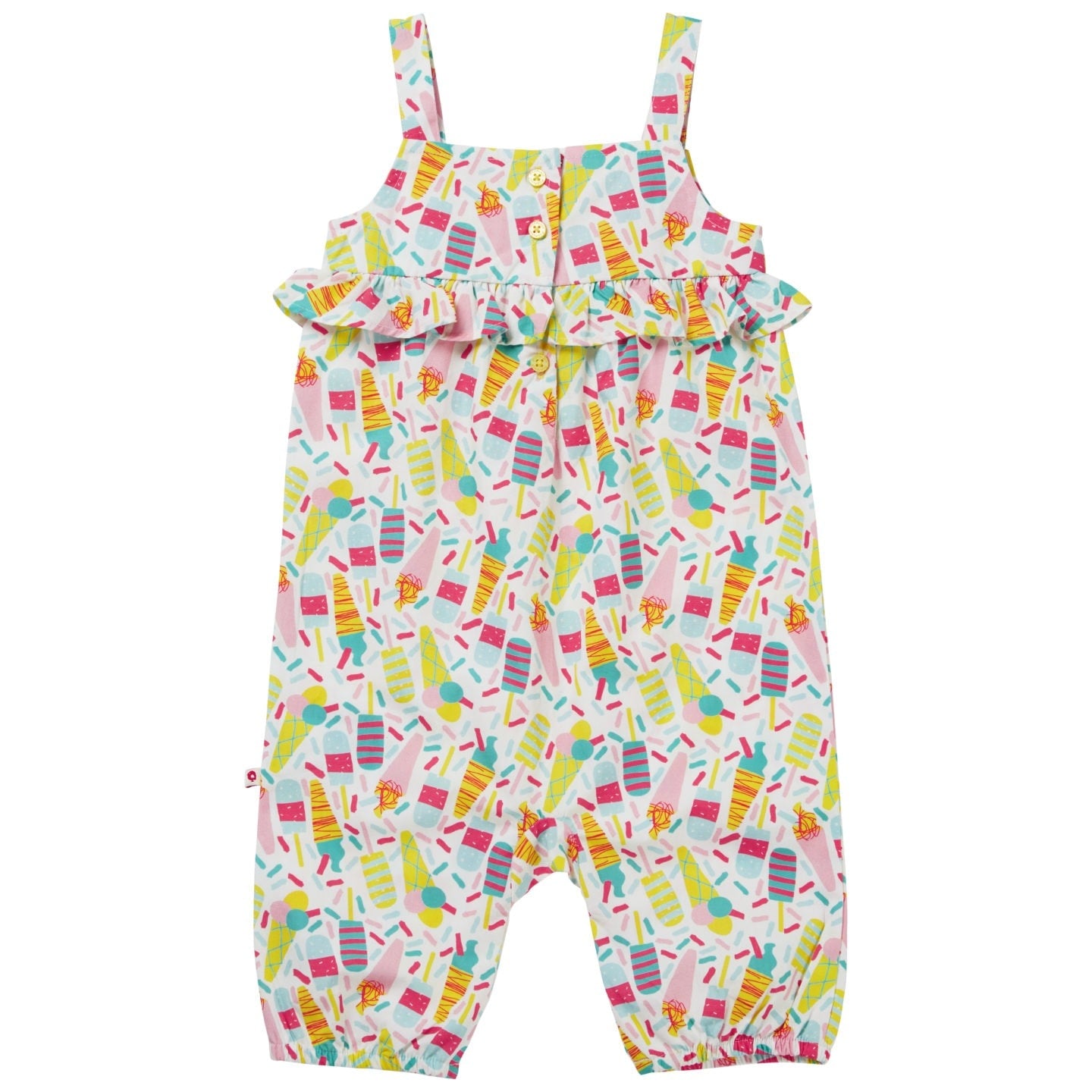 Estas bonitas jardineiras são feitas de algodão orgânico e apresentam um divertido padrão de gelados em turquesa, rosa, azul e amarelo. Podem ser usadas com uma t-shirt ou top por baixo ou apenas as jardineiras em dias quentes de verão.