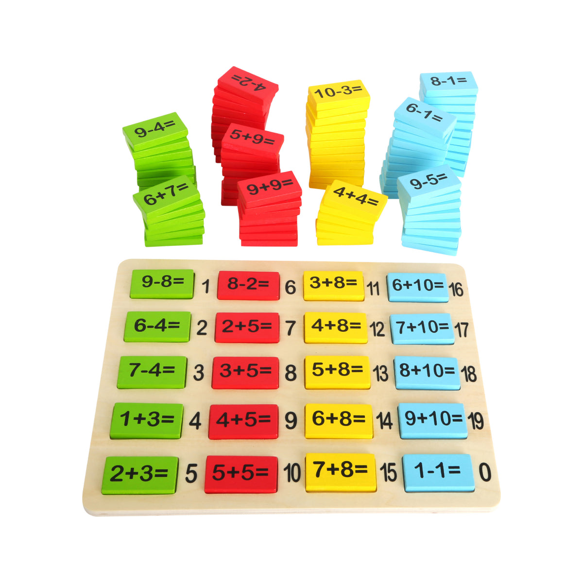 A matemática não é tão difícil, especialmente quando se pode praticar nesta placa de cálculo de madeira! O objetivo é que as operações das placas coloridas devem ser combinadas com os resultados que estão escritos na placa. As peças coloridas dos números motivam os jovens génios da matemática. Quem será o primeiro a resolver todas as suas operações?