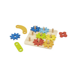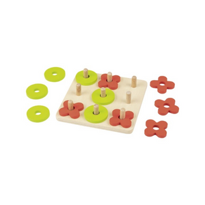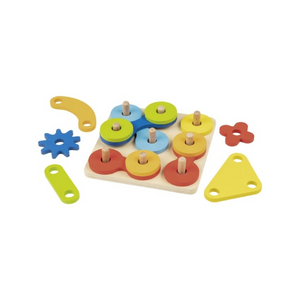 Este jogo tem 69 peças para encaixar nos pinos da placa de madeira . A criança pode ser criativa ou então seguir os modelos que vêm num folheto de apoio.