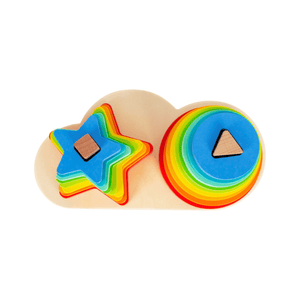 Tão colorido como o arco-íris! Com este jogo de encaixar e empilhar formas, o objetivo é empilhar formas idênticas umas sobre as outras por tamanho, para que as cores do arco-íris sejam formadas na ordem correta. Empilhar, inserir e classificar de forma lúdica ensinam as crianças sobre formas, cores e tamanhos enquanto treinam habilidades motoras finas e coordenação olho-mão. Os pinos móveis aumentam a segurança!