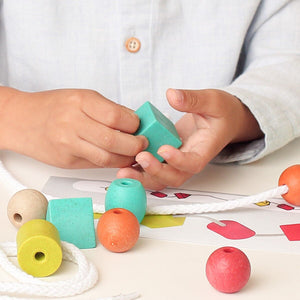 Este jogo educativo e ecológico permite as crianças enfiar diferentes formas geométricas tridimensionais usando uma corda, desenvolvendo a coordenação motora fina, a concentração e o raciocínio lógico.