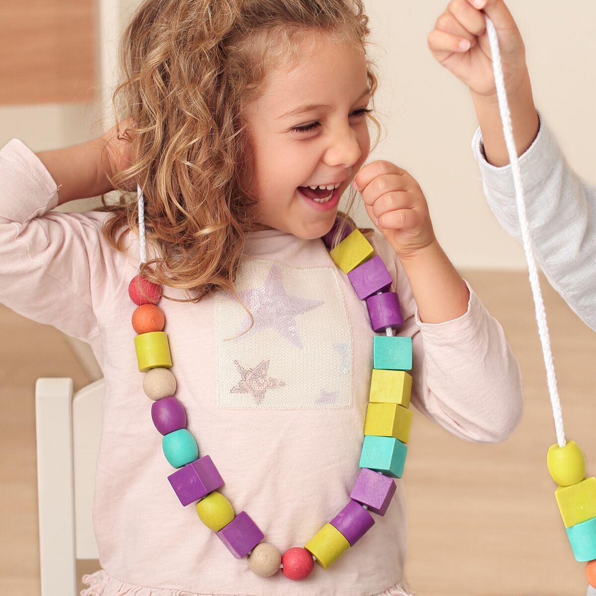 Com este divertido jogo, as crianças aprendem de forma lúdica a reconhecer formas e cores, familiarizando-se com conceitos matemáticos básicos, enquanto criam colares e sequências coloridas.