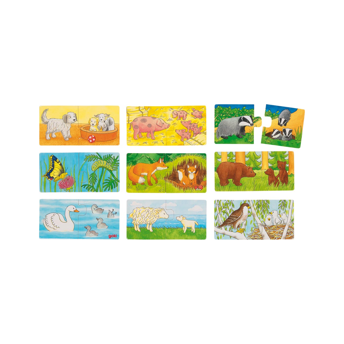 Neste mini-puzzle encontramos 9 mamãs e seus respetivos filhotes ilustrados em peças de madeira . A criança deve associar a mãe ao filho correto.