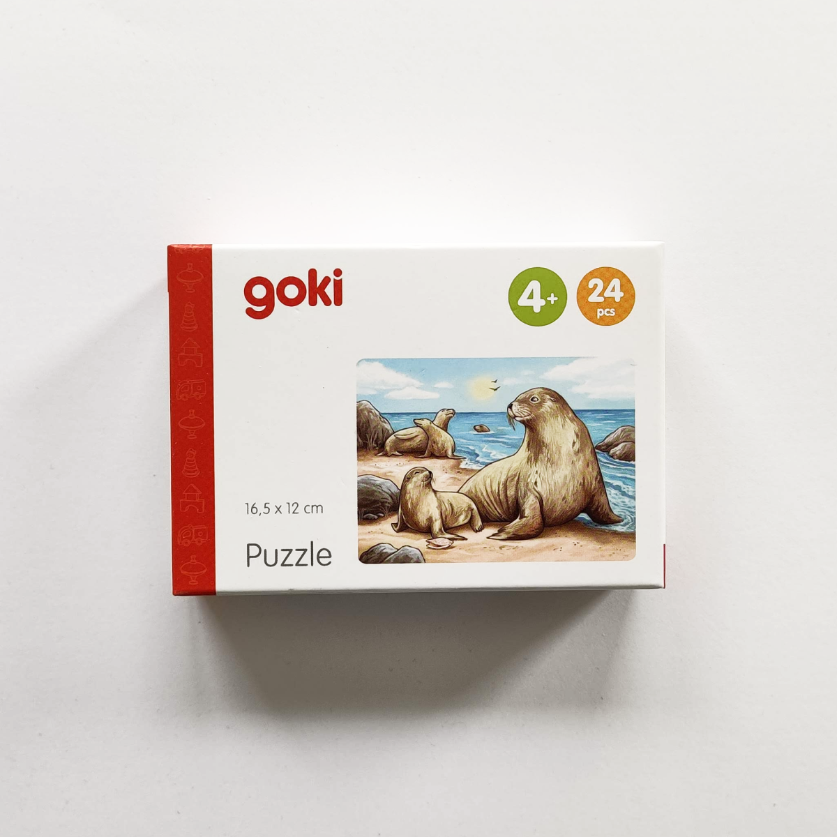 Este puzzle de 24 peças de madeira tem uma ilustração de uma foca.