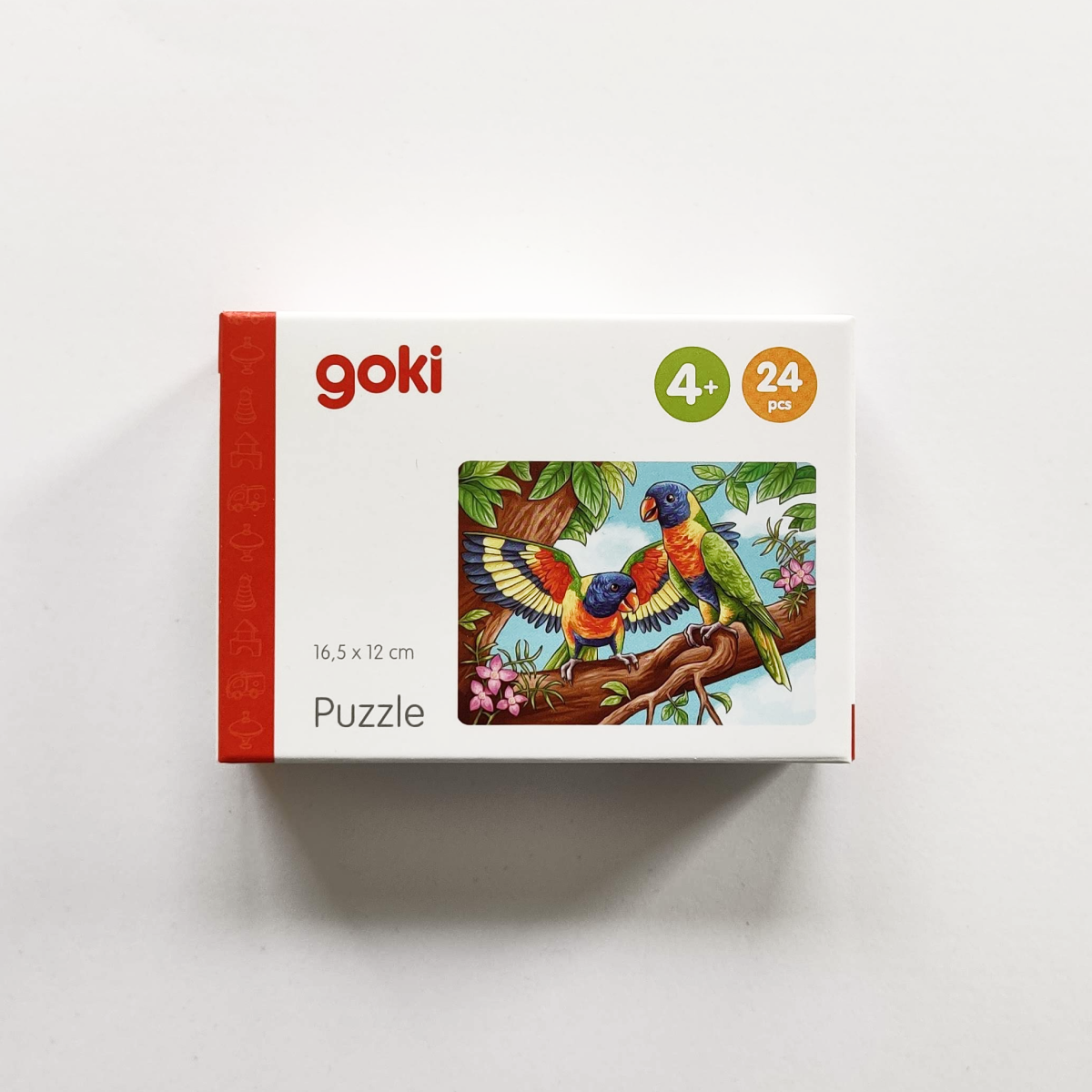 Este puzzle de 24 peças de madeira tem uma ilustração de um papagaio.