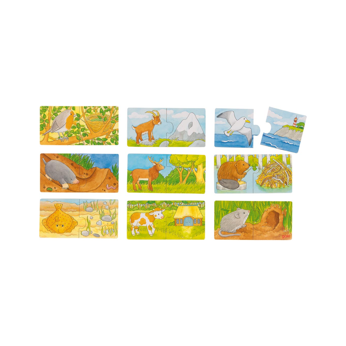 Neste mini-puzzle podemos encontrar 9 animais e seus respetivos habitats ilustrados em peças de madeira . A criança deve associar o animal ao habitat correto.