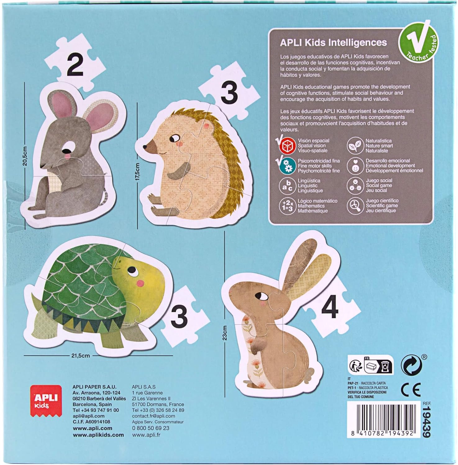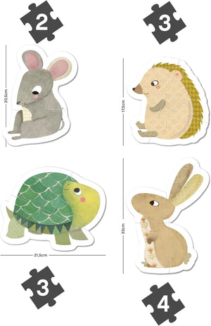 Composto por 16 peças grandes e fáceis de manusear, permite montar 4 puzzles progressivos com ilustrações de rato, ouriço, tartaruga e coelho, aumentando a dificuldade gradualmente.