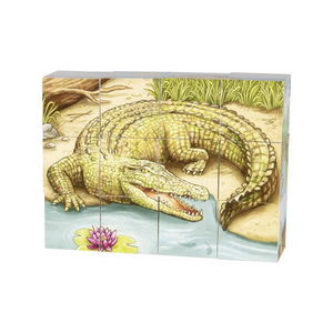 São 12 cubos que formam 6 puzzles de animais típicos da Austrália: tartaruga, canguru, crocodilo, foca, papagaio e koala.