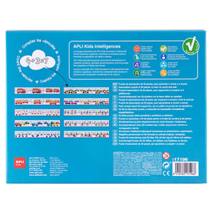 Composto por 30 peças resistentes, este puzzle permite formar 10 sequências de 3 peças, cada uma com uma soma simples representada por veículos coloridos.