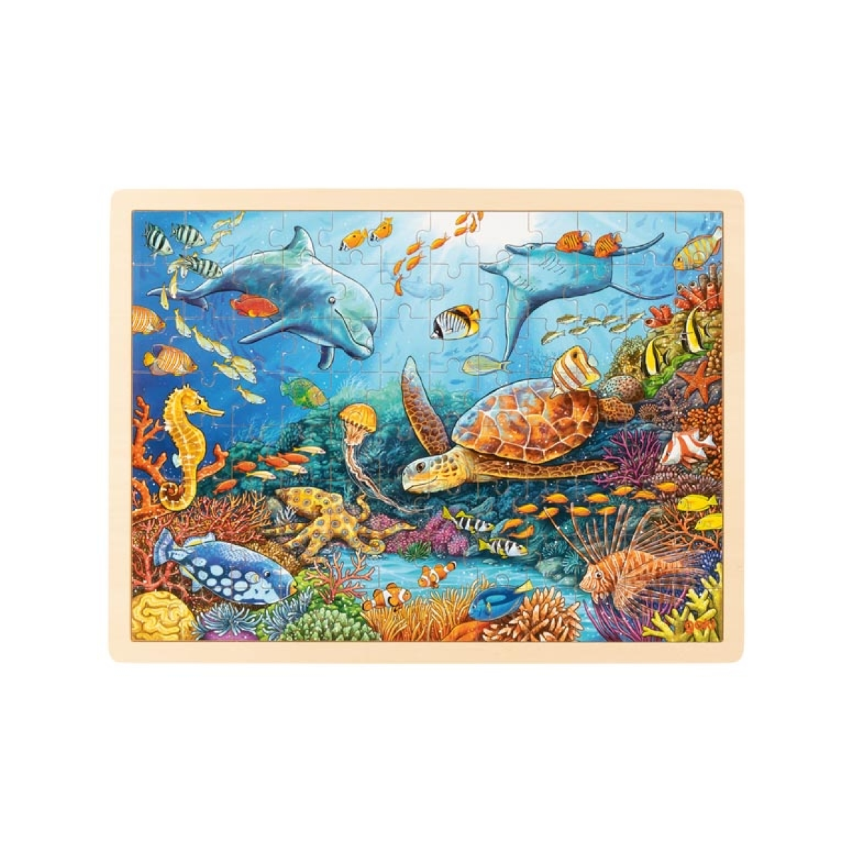 Este maravilhoso puzzle de 96 peças de madeira tem uma ilustração de um recife de coral. Inclui uma base de madeira para ser mais fácil de encaixar as peças.
