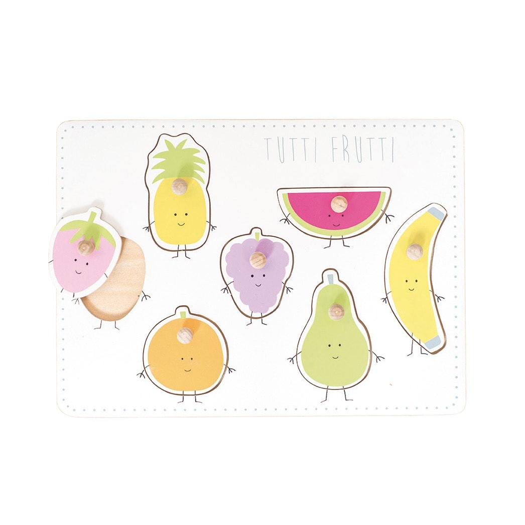 Um puzzle de madeira divertido com 7 frutos diferentes! Cada peça de fruta tem uma pega em madeira que facilita o pegar para encaixar no local correto. Desenvolve a motricidade fina, a coordenação óculo-manual e a linguagem.