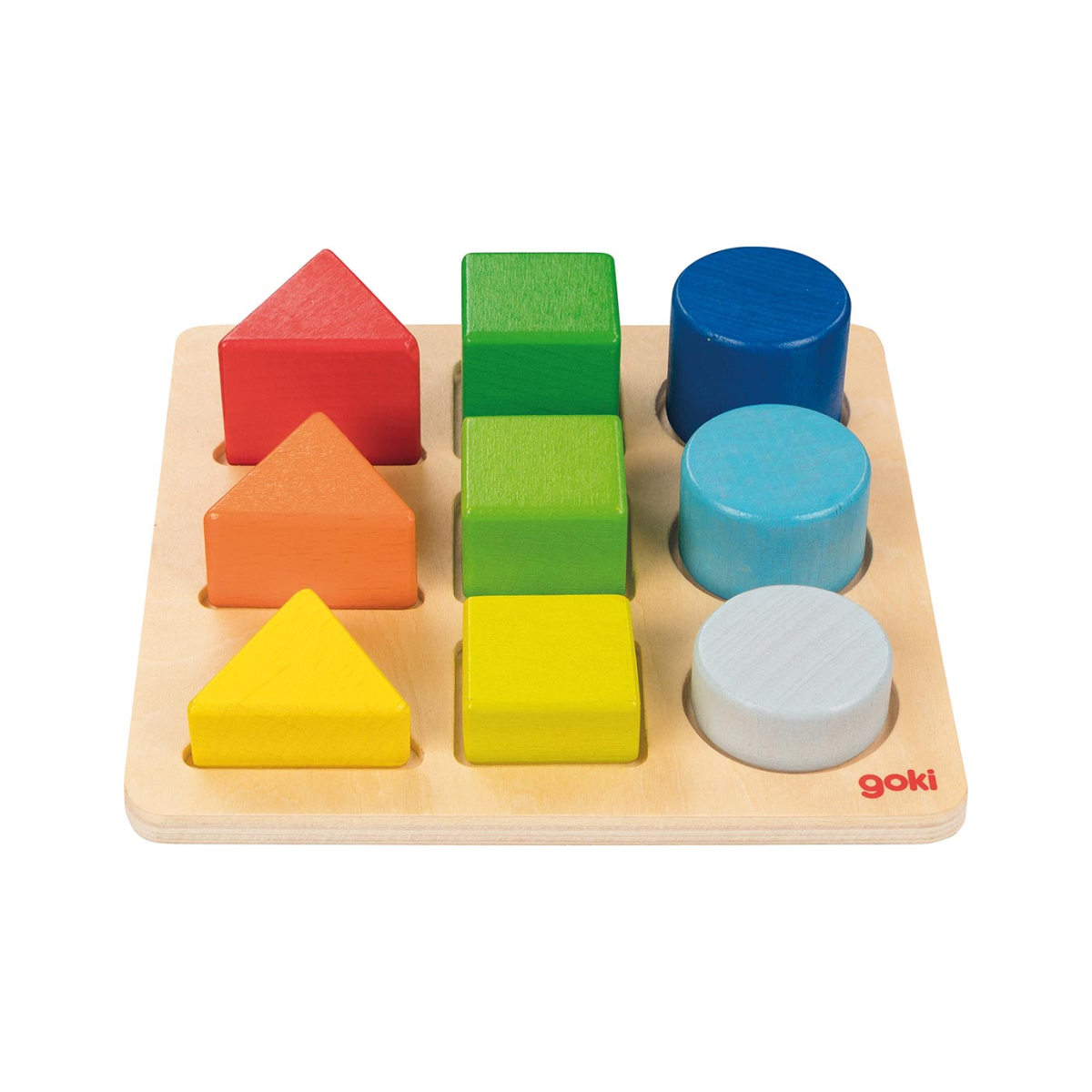 Estas 9 peças geométricas (3 tamanhos, formas e cores diferentes) podem ser classificadas, contadas e encaixadas numa base de madeira.