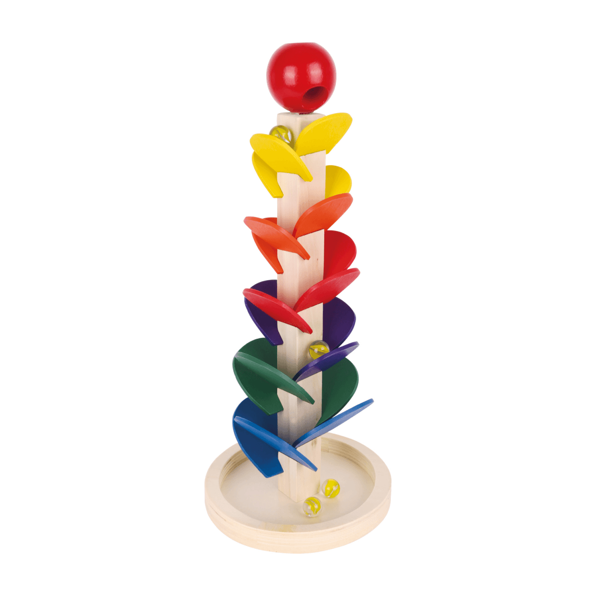 Esta torre é uma verdadeira experiência sonora! Depois que o berlinde de vidro é colocado na bola de madeira vermelha, a melodia percorre a torre até à base. Os berlindes caiem sobre as folhas coloridas em forma de leque de madeira, que têm cores, tamanhos e sons diferentes. Um brinquedo que encanta crianças!