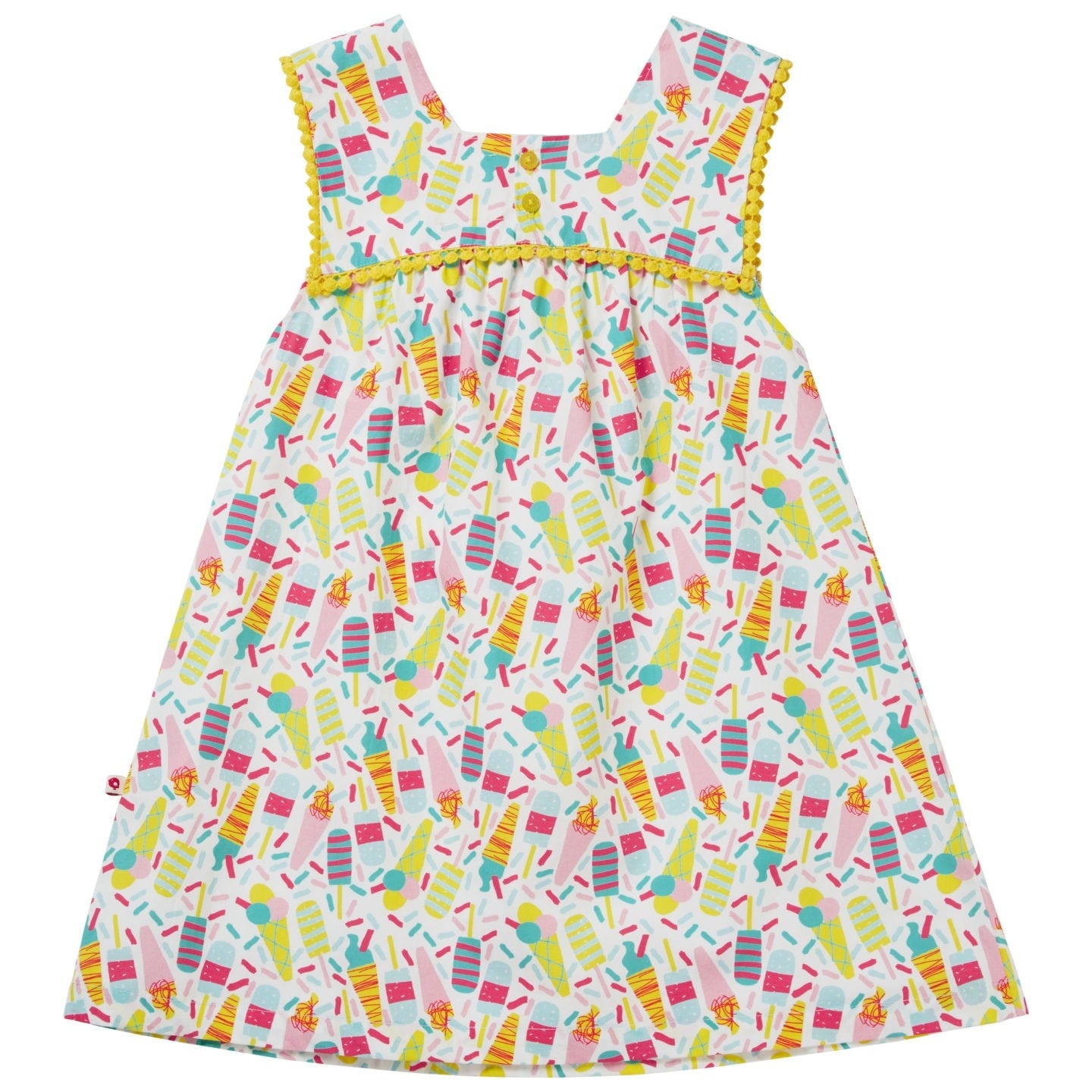 Este bonito vestido sem mangas é feito de algodão orgânico e apresenta um divertido padrão de gelados em turquesa, rosa, azul e amarelo. Óptimo para os dias quentes de Verão!